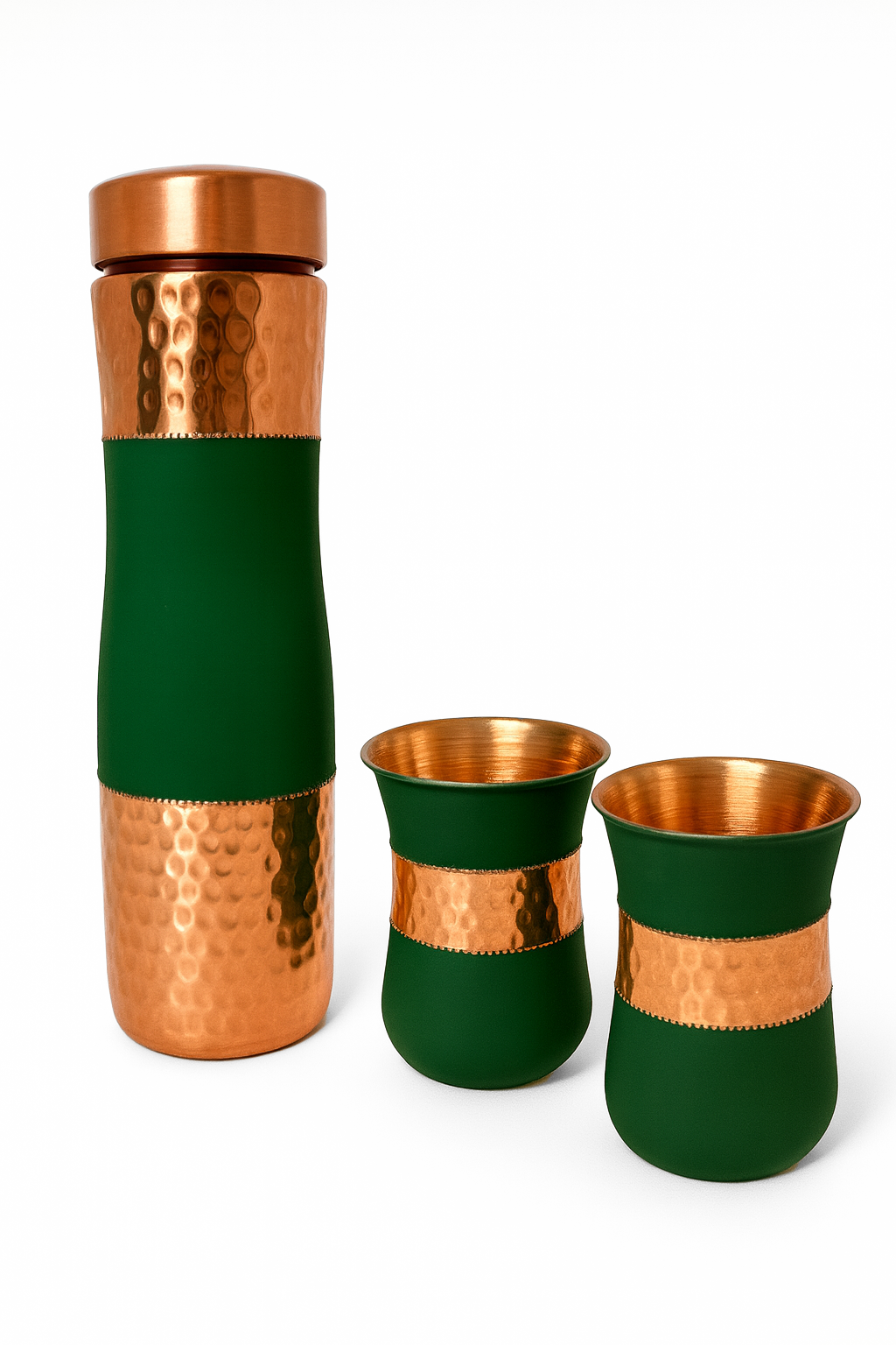 W Ajurwedzie przechowywanie wody w miedzianych naczyniach przez noc i picie jej rano jest prostym rytuałem sprzyjającym wewnętrznej równowadze. Dzbanek miedziany DARAYA pozwala przygotować wodę „tamra jal” na poranek dla dwóch osób, a dwa kubki miedziane tworzą gotowy komplet do wspólnego picia – bez konieczności sięgania po dodatkowe naczynia.