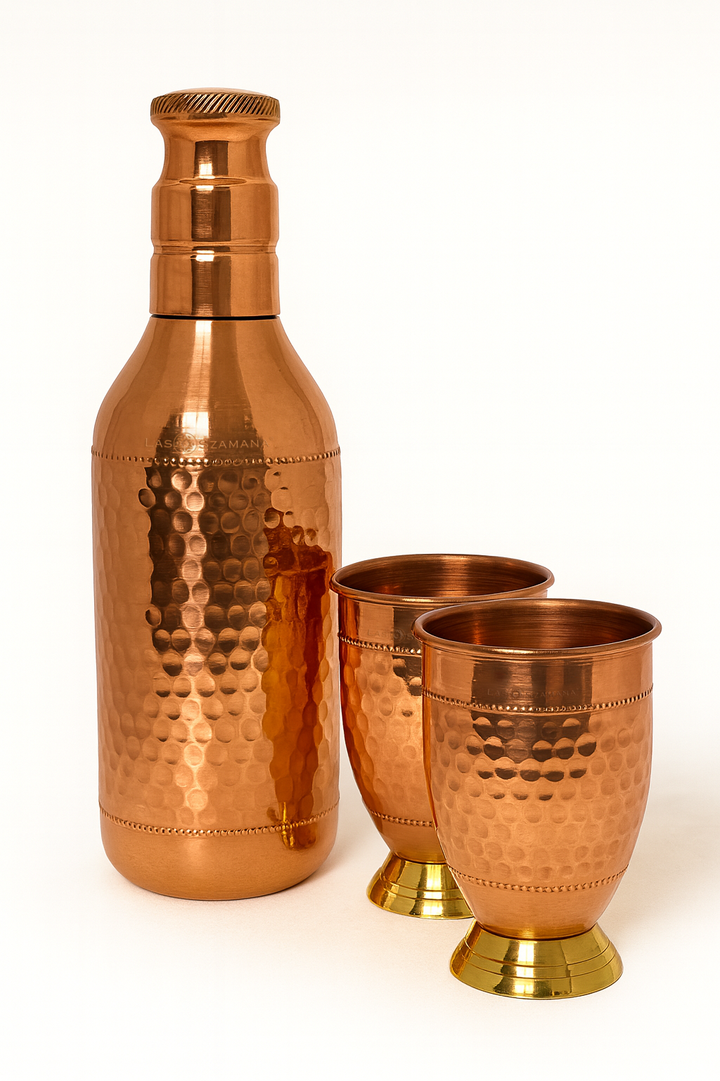 W Ajurwedzie przechowywanie wody w miedzianych naczyniach przez noc i picie jej rano jest prostym rytuałem wspierającym wewnętrzną równowagę. Dzbanek miedziany DHARANI dzięki większej pojemności pozwala przygotować wodę „tamra jal” na poranek dla dwóch osób, a dwa kubki miedziane tworzą gotowy zestaw do wspólnego picia – bez potrzeby używania dodatkowych naczyń.