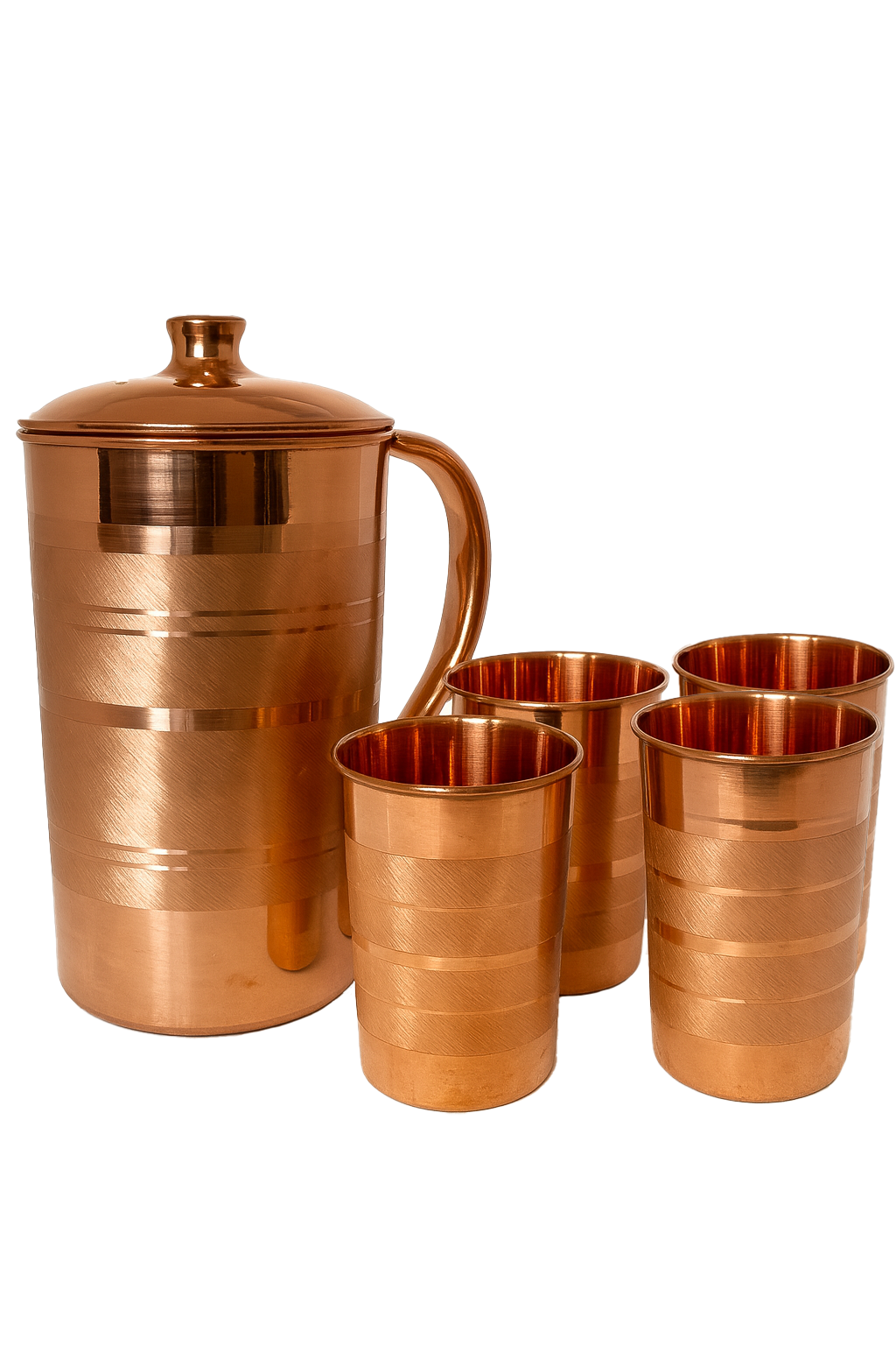 Zestaw Dzbanek Miedziany KAVIRA + 4 Kubki Miedziane, o pojemności 1700 ml oraz pojemności kubków 275 ml, to harmonijne połączenie ajurwedyjskiej tradycji picia wody z nowoczesną estetyką stołu. Pojemny dzbanek miedziany wraz z czterema kubkami tworzy spójny komplet, dzięki któremu możesz serwować wodę w miedzianych naczyniach dla siebie, rodziny lub gości. To doskonały zestaw do kuchni, salonu, przestrzeni biurowej, studia jogi czy kameralnych kręgów i ceremonii.