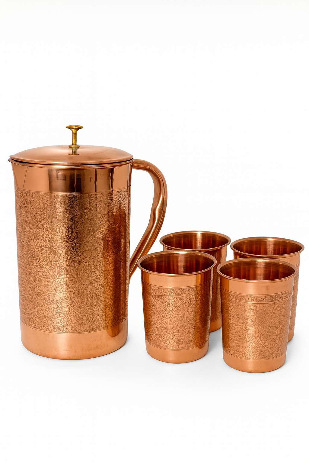 W Ajurwedzie przechowywanie wody w miedzianych naczyniach przez noc i picie jej rano jest prostym rytuałem sprzyjającym wewnętrznej równowadze. Dzbanek miedziany YAMINA pozwala przygotować wodę „tamra jal” dla kilku osób, a cztery kubki miedziane tworzą gotowy komplet do wspólnego picia – bez potrzeby sięgania po inne naczynia.
