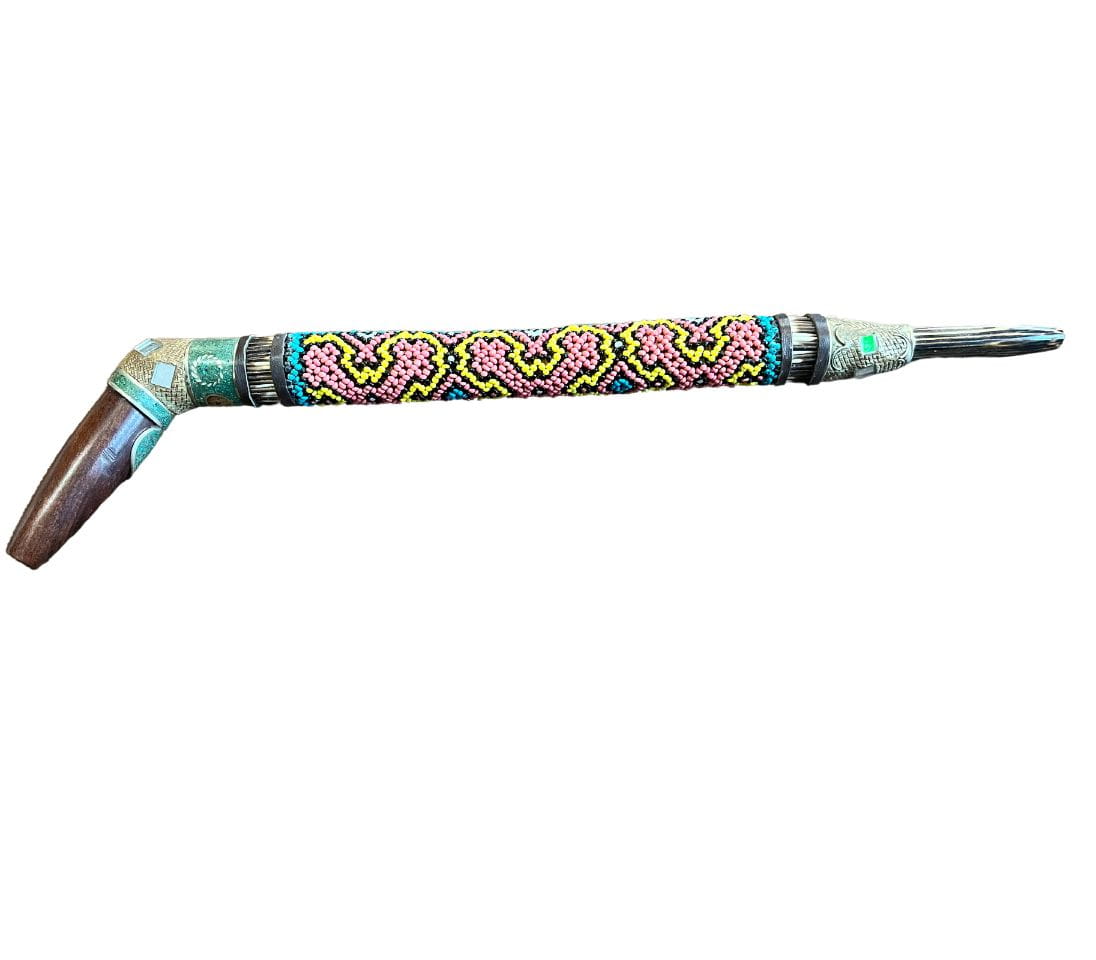 Tak właśnie nazwaliśmy tę dłuższą rurkę do aplikacji rapé, która oczarowuje hipnotyzującym połączeniem różu, żółci i kontrastującego tła. Zdobienia koralikowe, ułożone w falisty, rytmiczny wzór, zdają się wręcz wibrować energią, przyciągając wzrok i wspomagając głębsze przeżycia podczas ceremonii.